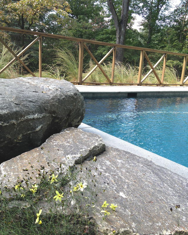 This serene woodland property in Garrison was the site of an older house with a chicken coop at the far end. The owners wanted to update the house and add a pool, using the former chicken lodge as the framework for a new pool house.