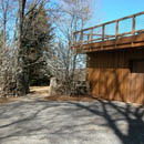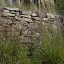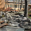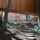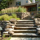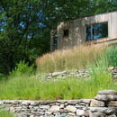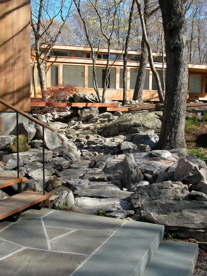 A drainage swale was created just outside the house windows, bringing the ledges right up to the facade of the building. Sensitively built with site-gathered stones, it guides water beautifully around the structure. Trees were preserved as much as possible and also bring the feeling of the woodland as close as possible to the house. A simple walkway/bridge leads one out of the living room, over a dry stream bed, and into the wild.