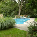 The design solution included a patio area and pool deck separated by trees and grasses to make an intriguing web of interconnected spaces. Nearby neighbors are screened and there is a sense of being in your own private world of intimacy and peaceful relaxation. Trees near the house can make a beautiful and valuable contribution in achieving uniquely shaded spaces and privacy, contrary to common beliefs that any tree near a house is bad.