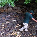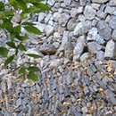 Some on-site experimentation was done with various types of stones available at the local stone yard, and a patterning emerged that soon become very alive. The thinner sides of the stones fit nicely together and made lines that followed a delightful undulating pattern that echoed the topography of the land. The affect is striking, and adds a wonderful texture to the ground plane. The texture slowly transitions to rounder stones as it meets a water feature above built in a previous design phase.