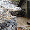 Several years after the original “Woodland Spaces” project, a deck was built outside a second floor home office space. It projected outward to the land, further connecting the house to the woodland spaces outside. However, because of the steep slope there was a problem with soil and bark mulch washing onto the deck from the rain, wind and wild animals. For the same reasons there was also an ongoing problem with getting plants to grow on the abrupt earthen hillside.
