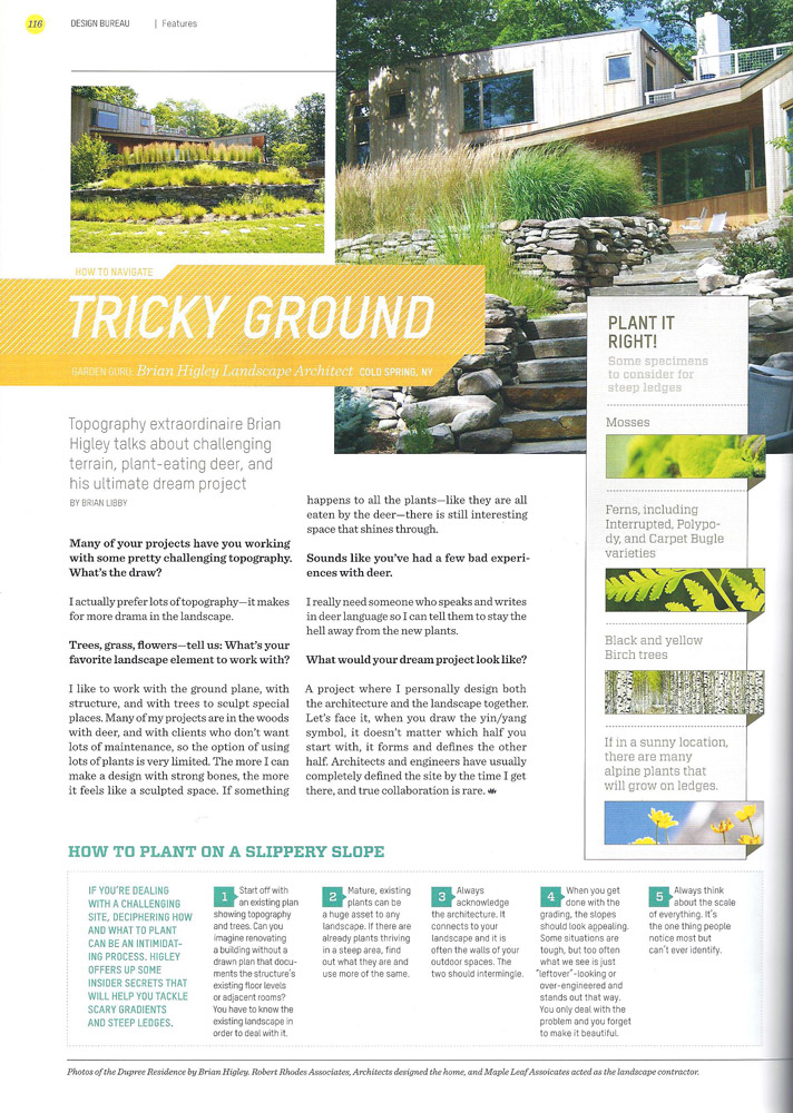 (photos of Higley's work at residence of Marilyn Minter & Bill Miller, Landscape photos Incorrectly attributed to House designer, Architect Stan Allen.)